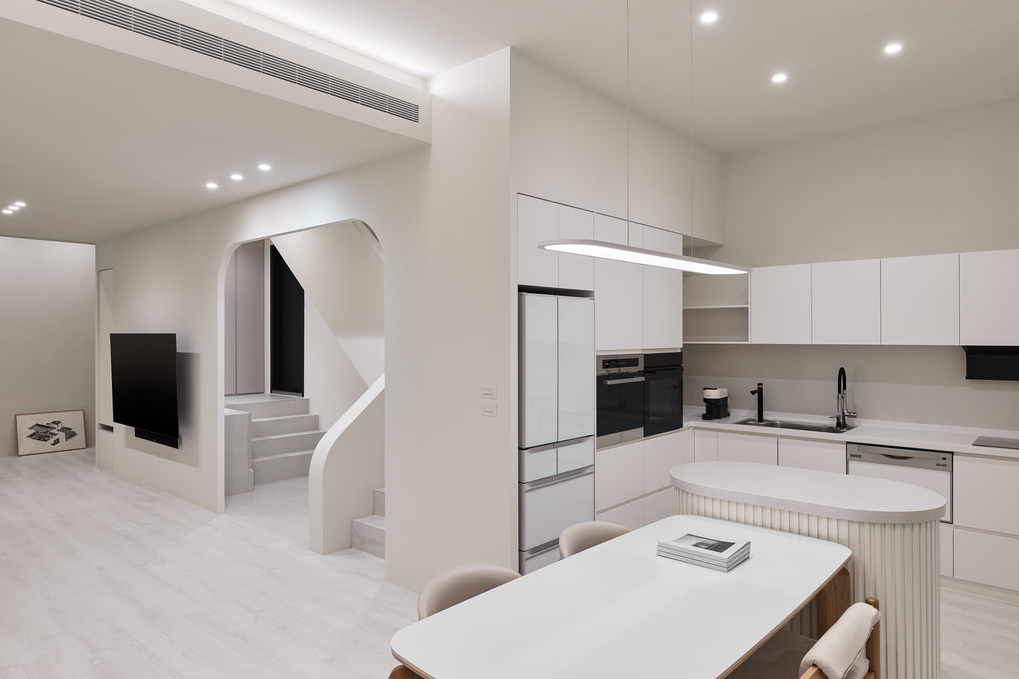 Reimagining traditional layouts, core public functions—entry, living, and kitchen—are consolidated on B1. This creates a private sanctuary with dual-circulation access, serving as the heart of daily life and the origin of all vertical movement.