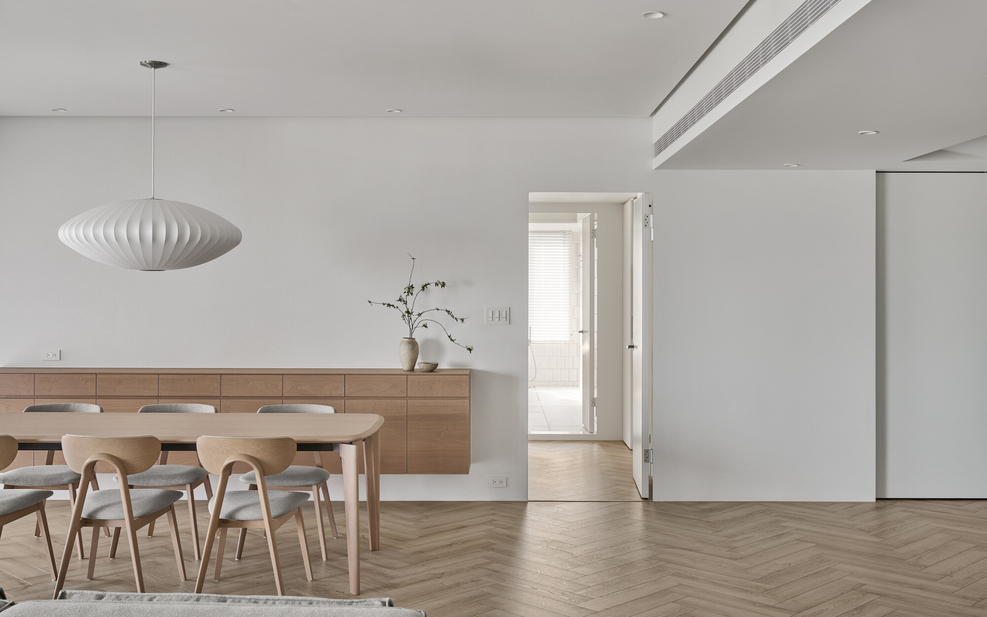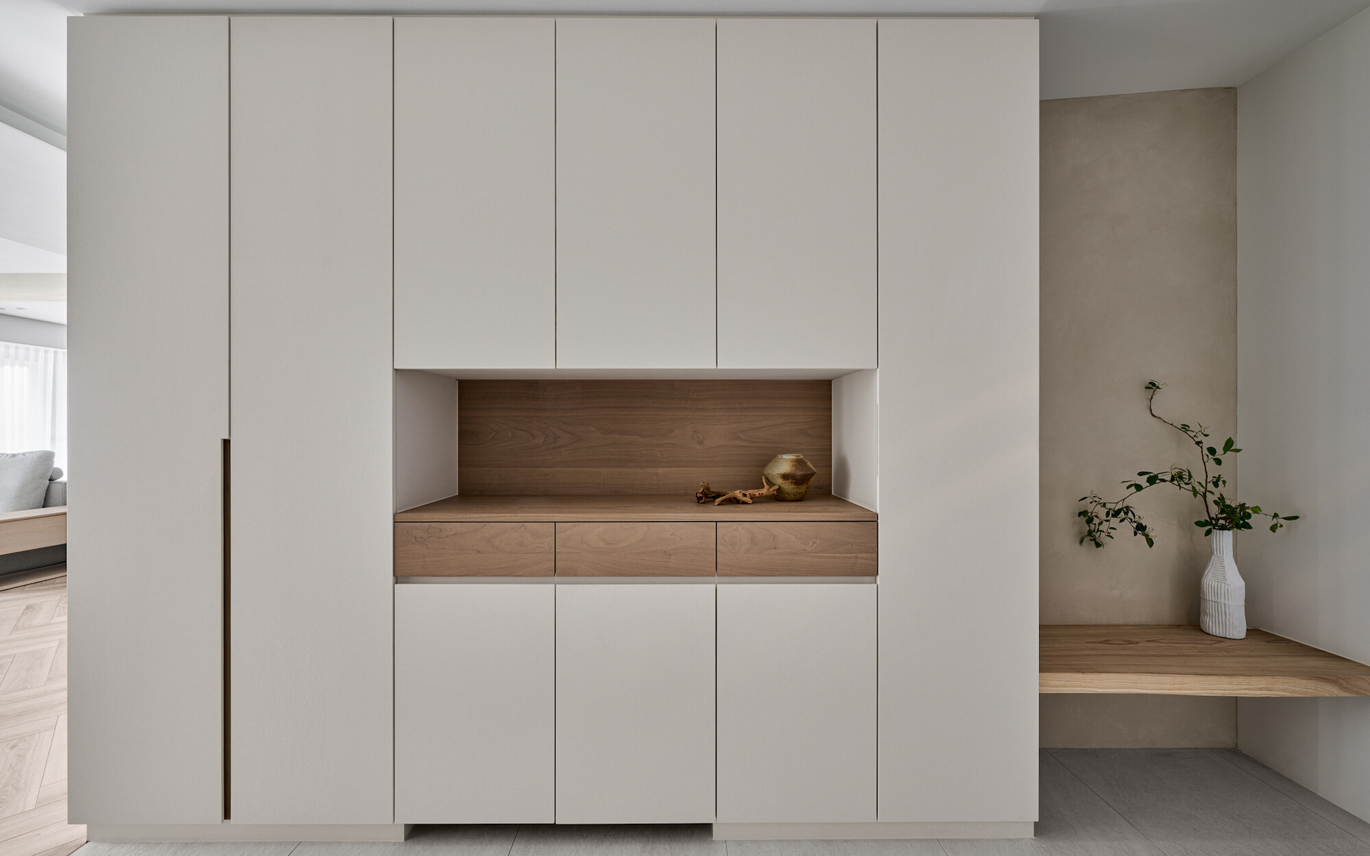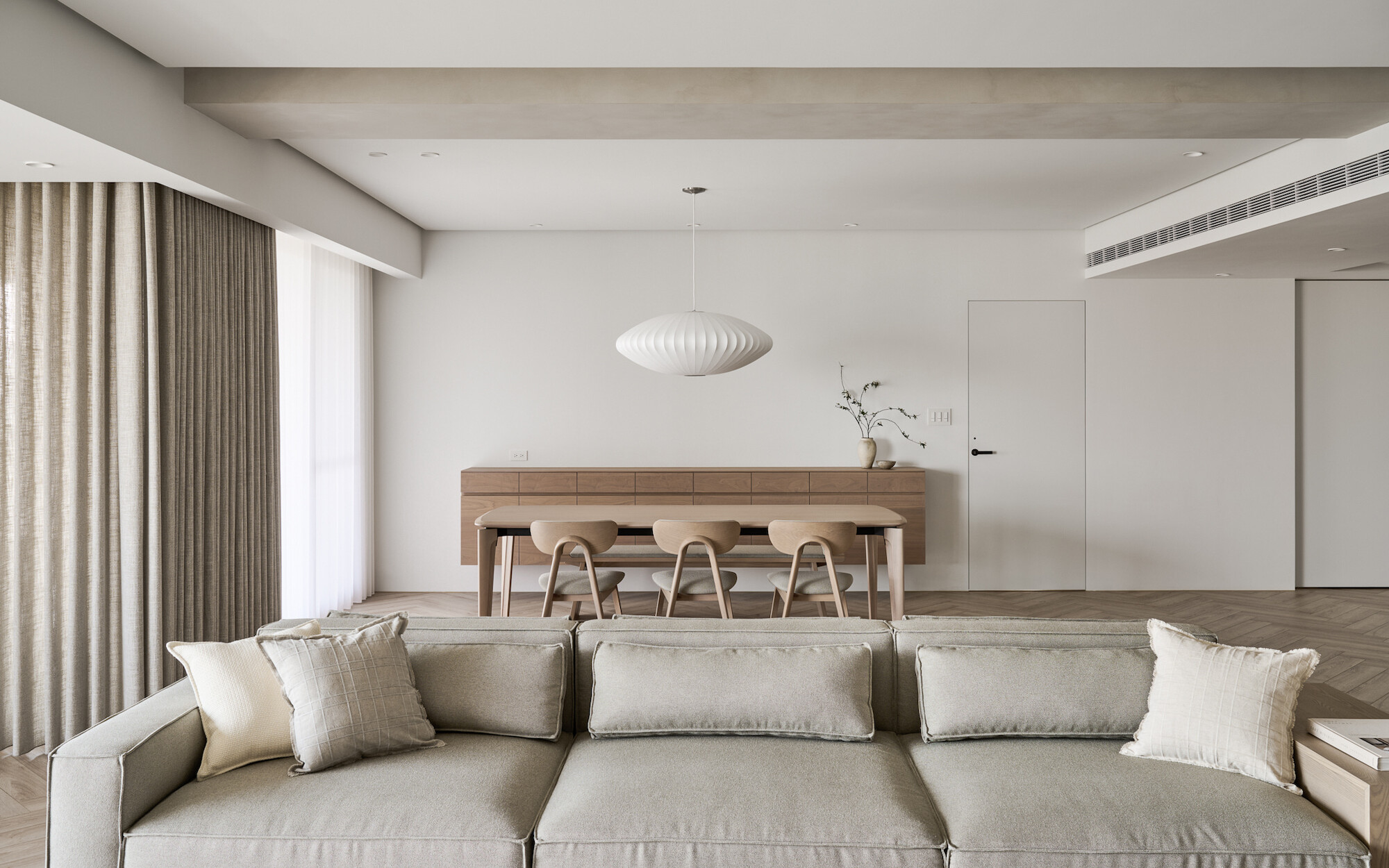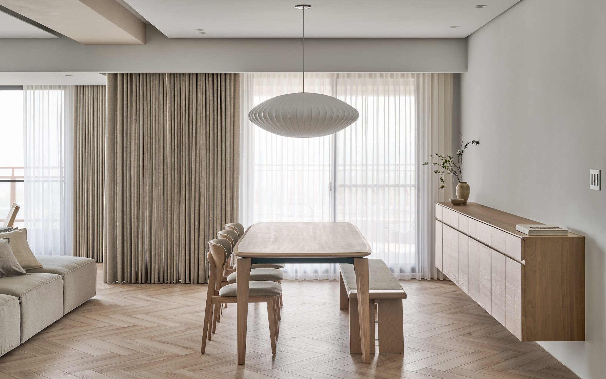 The living room, floral arrangement area, and dining room, comprising three functional units, form a continuous and open public space. The two-way sofa arrangement creates possibilities for various usage scenarios. While the husband gathers with friends in the living room, the wife simultaneously conducts teaching demonstrations in the floral arrangement area. The space can be used independently while maintaining a sense of interconnectedness.