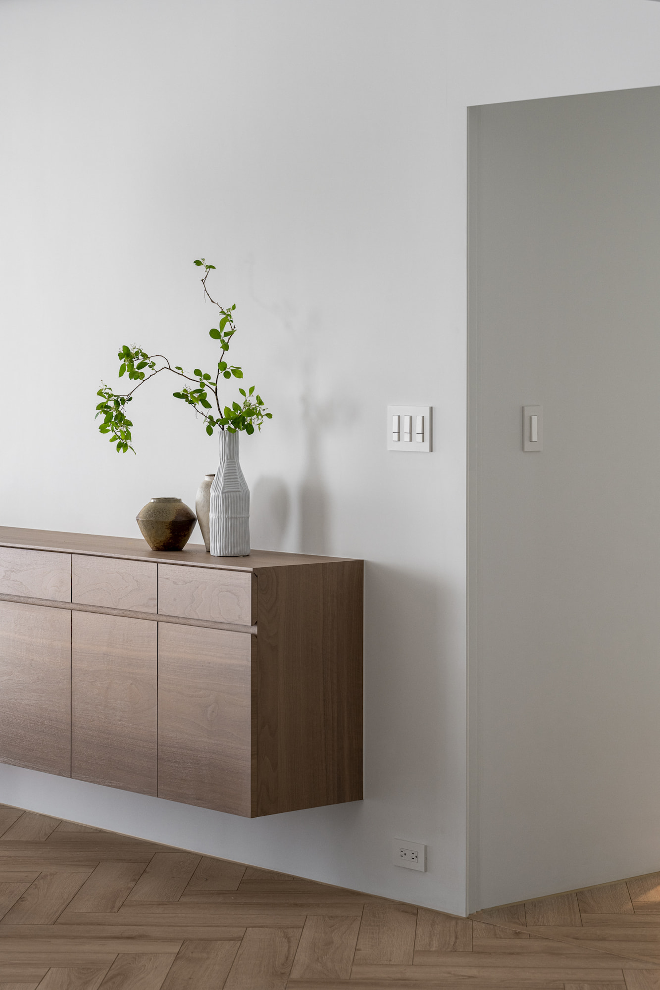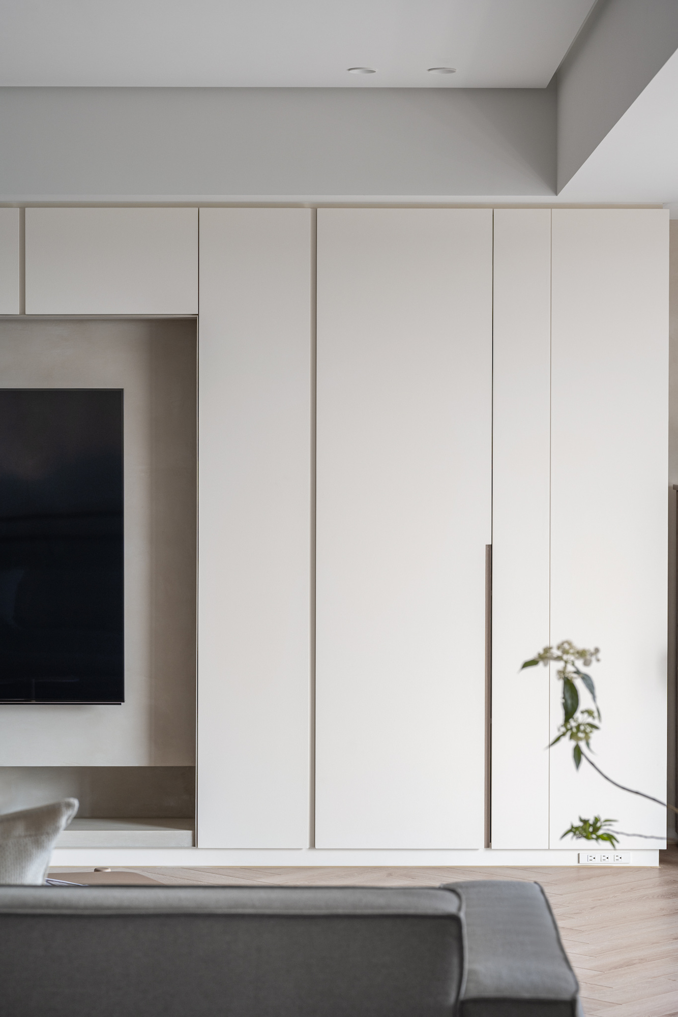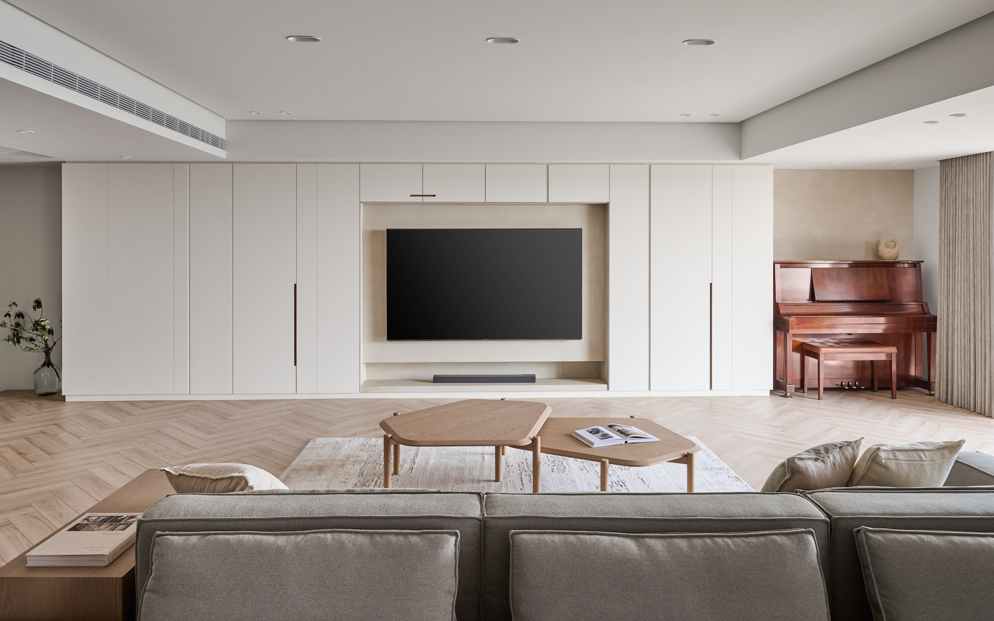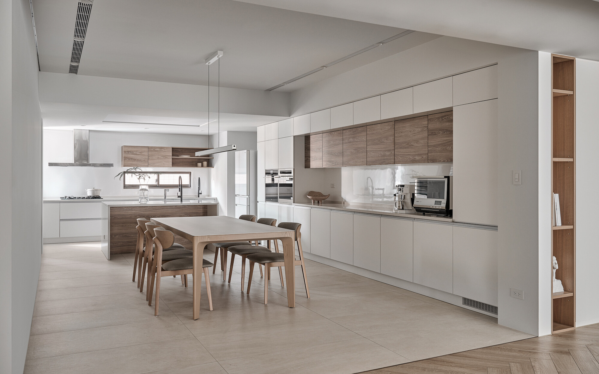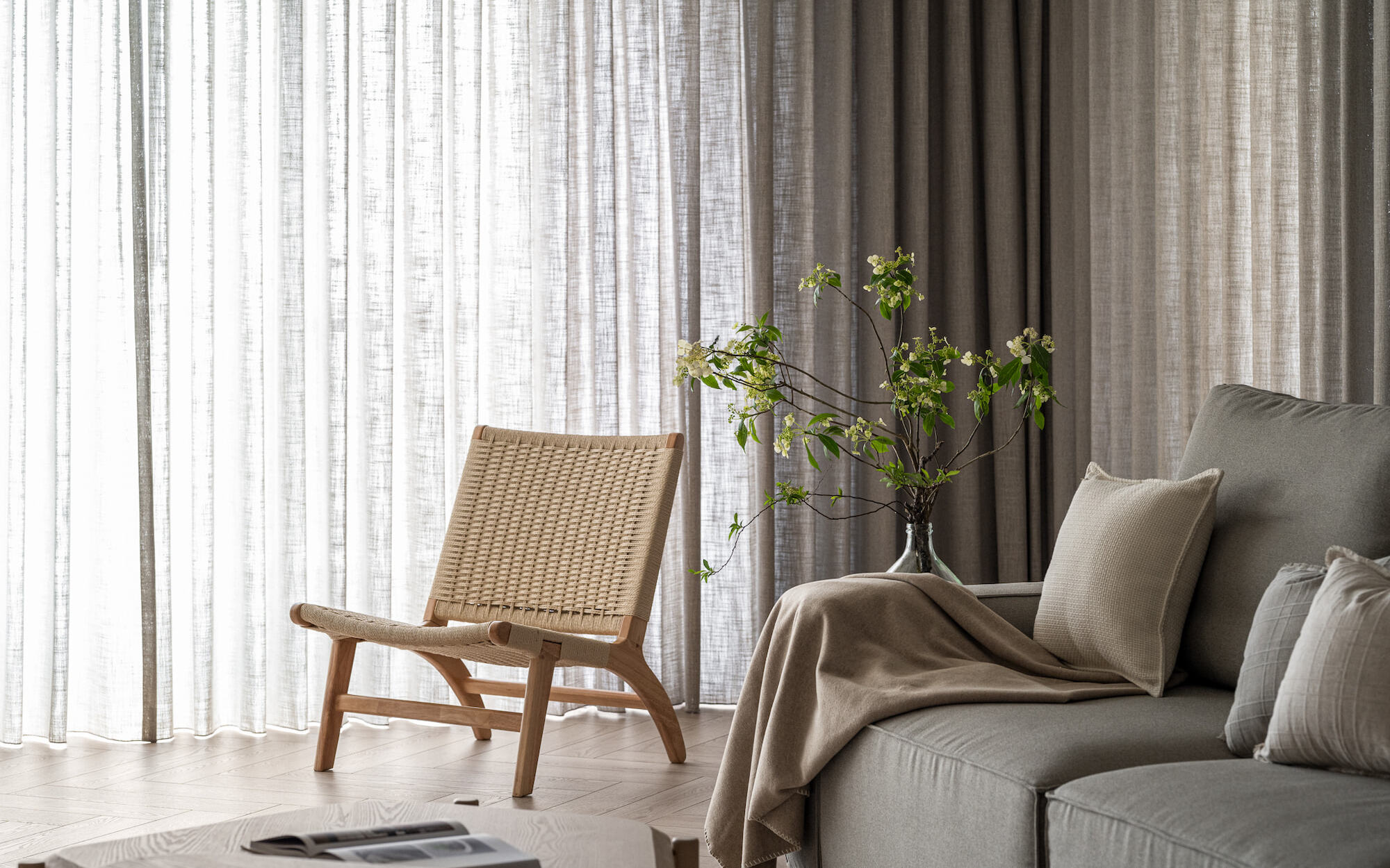 The living room, floral arrangement area, and dining room, comprising three functional units, form a continuous and open public space. The two-way sofa arrangement creates possibilities for various usage scenarios. While the husband gathers with friends in the living room, the wife simultaneously conducts teaching demonstrations in the floral arrangement area. The space can be used independently while maintaining a sense of interconnectedness.