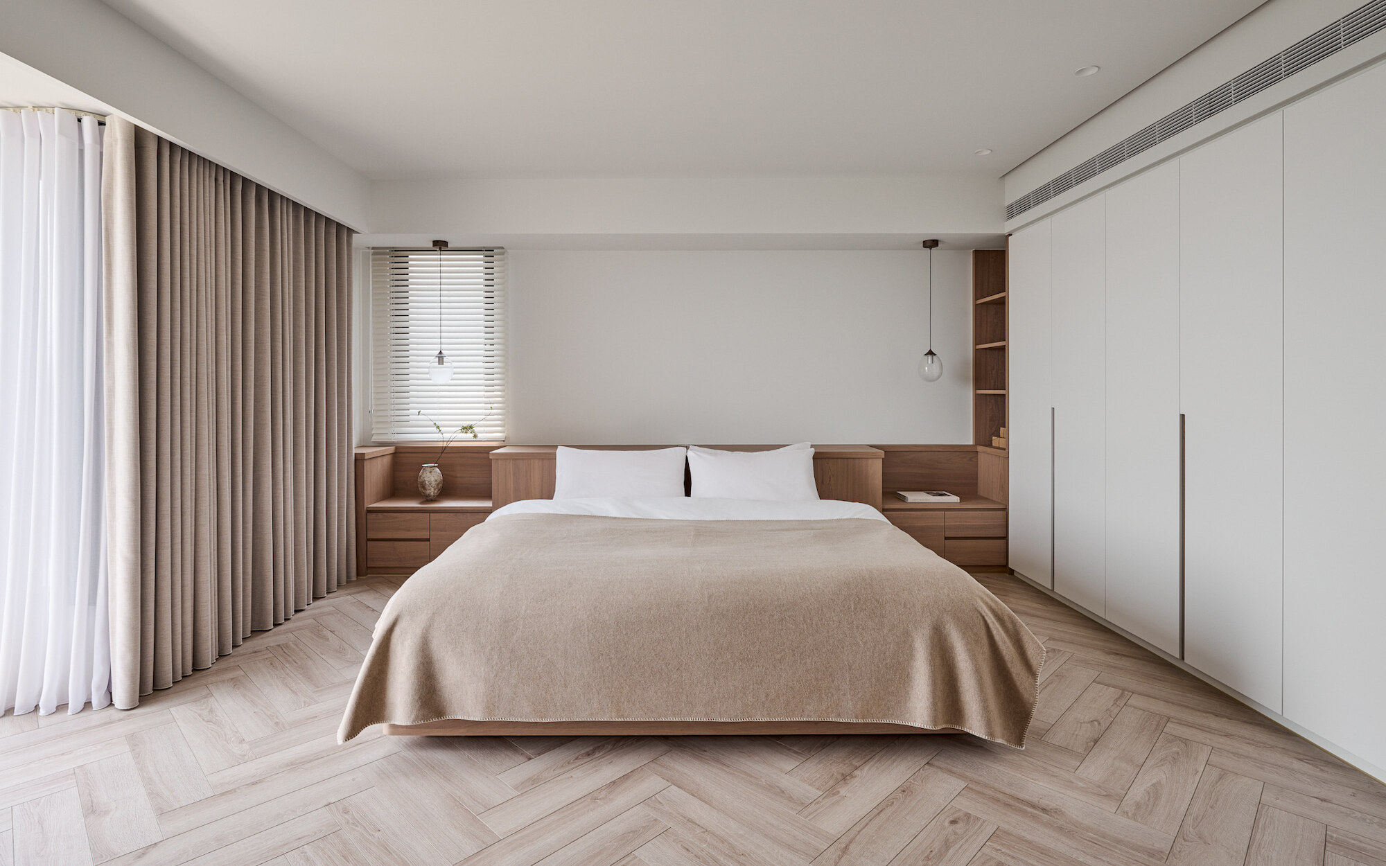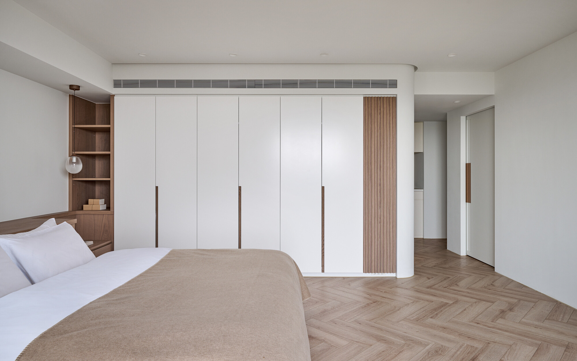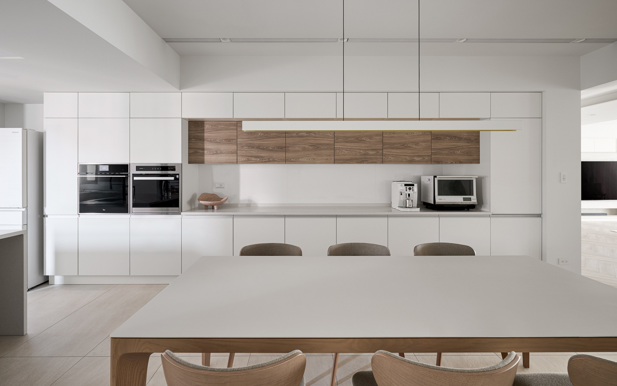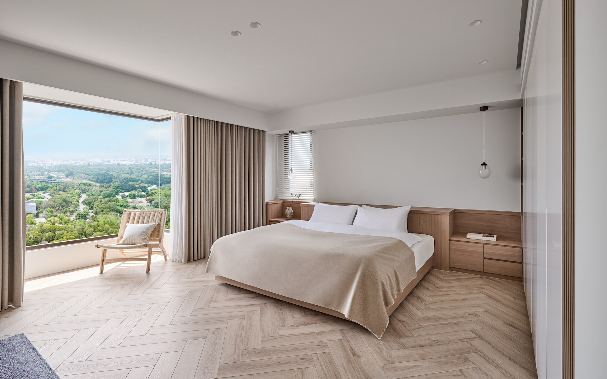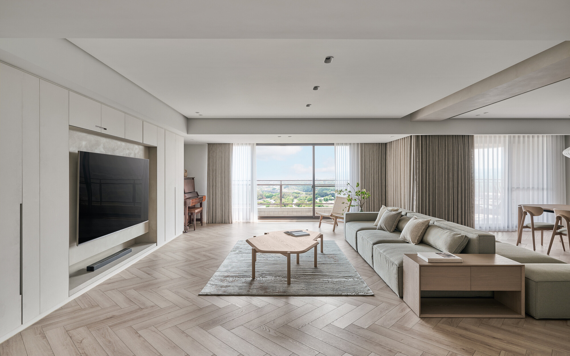 The site faces a lush forest, boasting an excellent geographical location that allows for a view of the vast and eternal greenery from indoors. Leveraging the existing nearly 16-meter-wide floor-to-ceiling windows, the design enhances the continuity of the panoramic view and maximizes natural light intake.