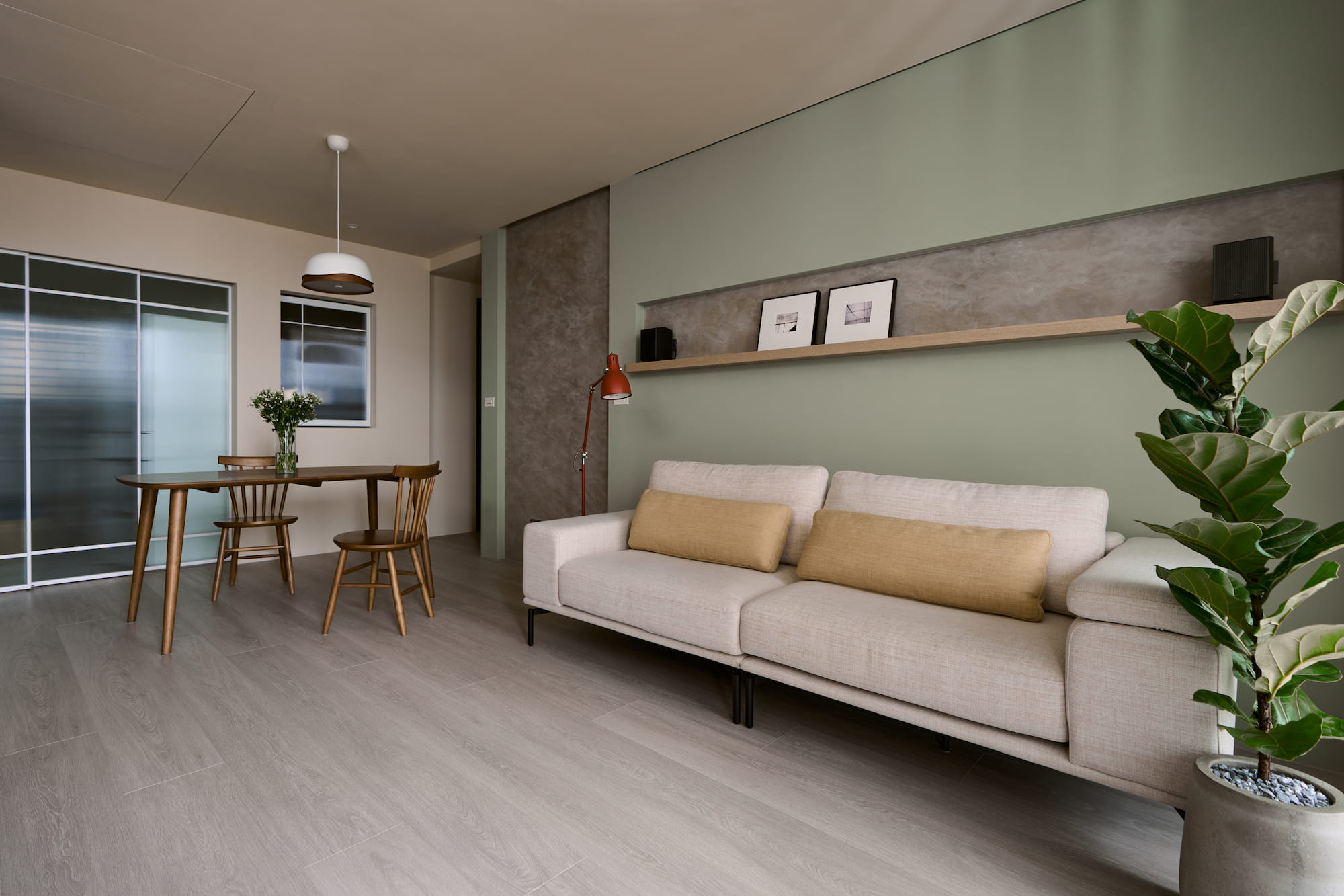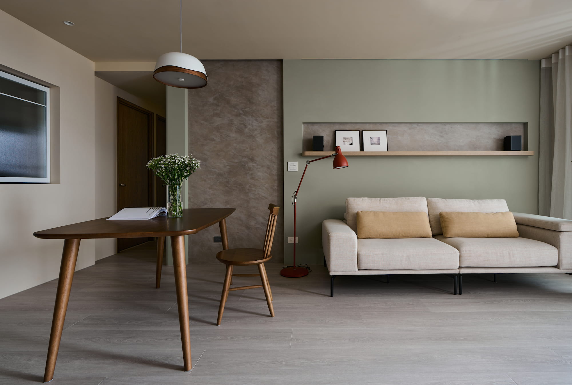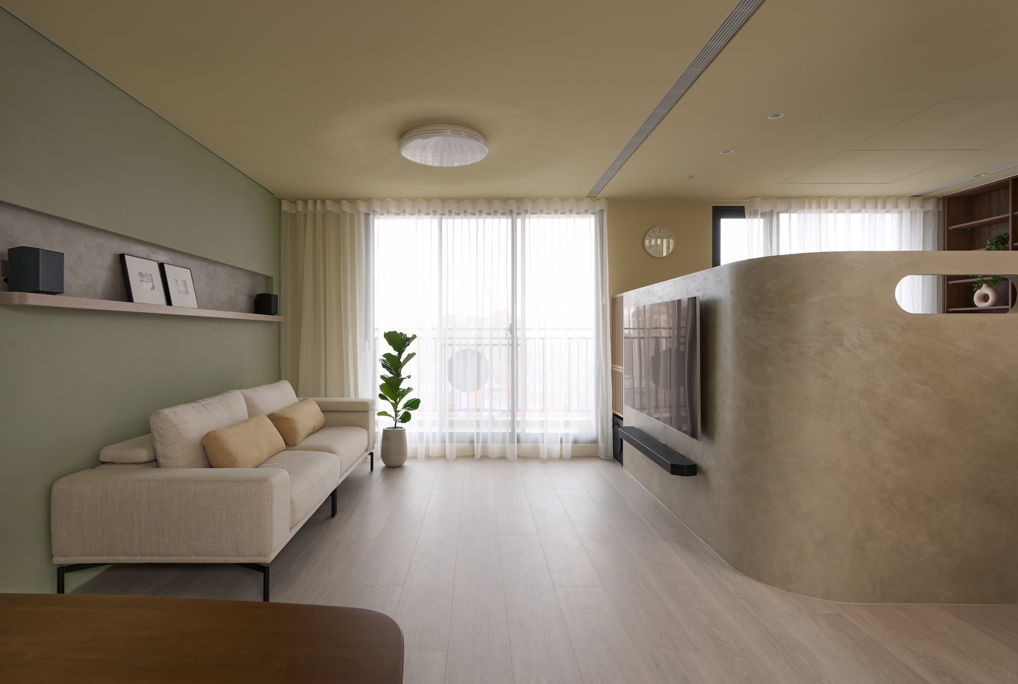 色彩搭配用充滿生機的黃綠色調,輔以沉穩內斂的斯曼特灰,編排出視覺節奏,這種大膽跳躍而和諧的配色比起單一色調,對於幼兒在色彩認知可產生啟發。細節處理上,居家各處轉角均採用圓弧造型,顧及孩童的安全,又為整個空間增添了一份柔和細膩的氛圍。