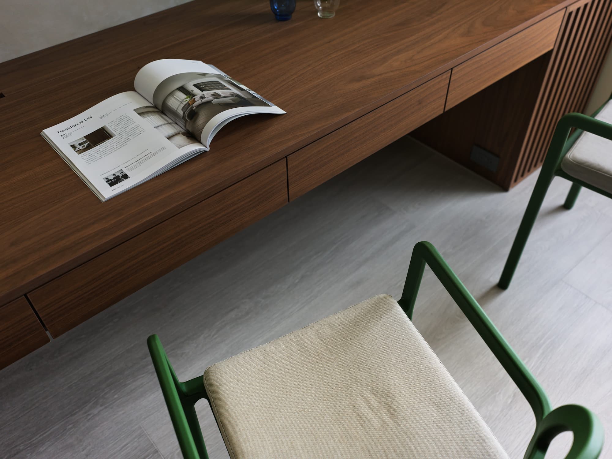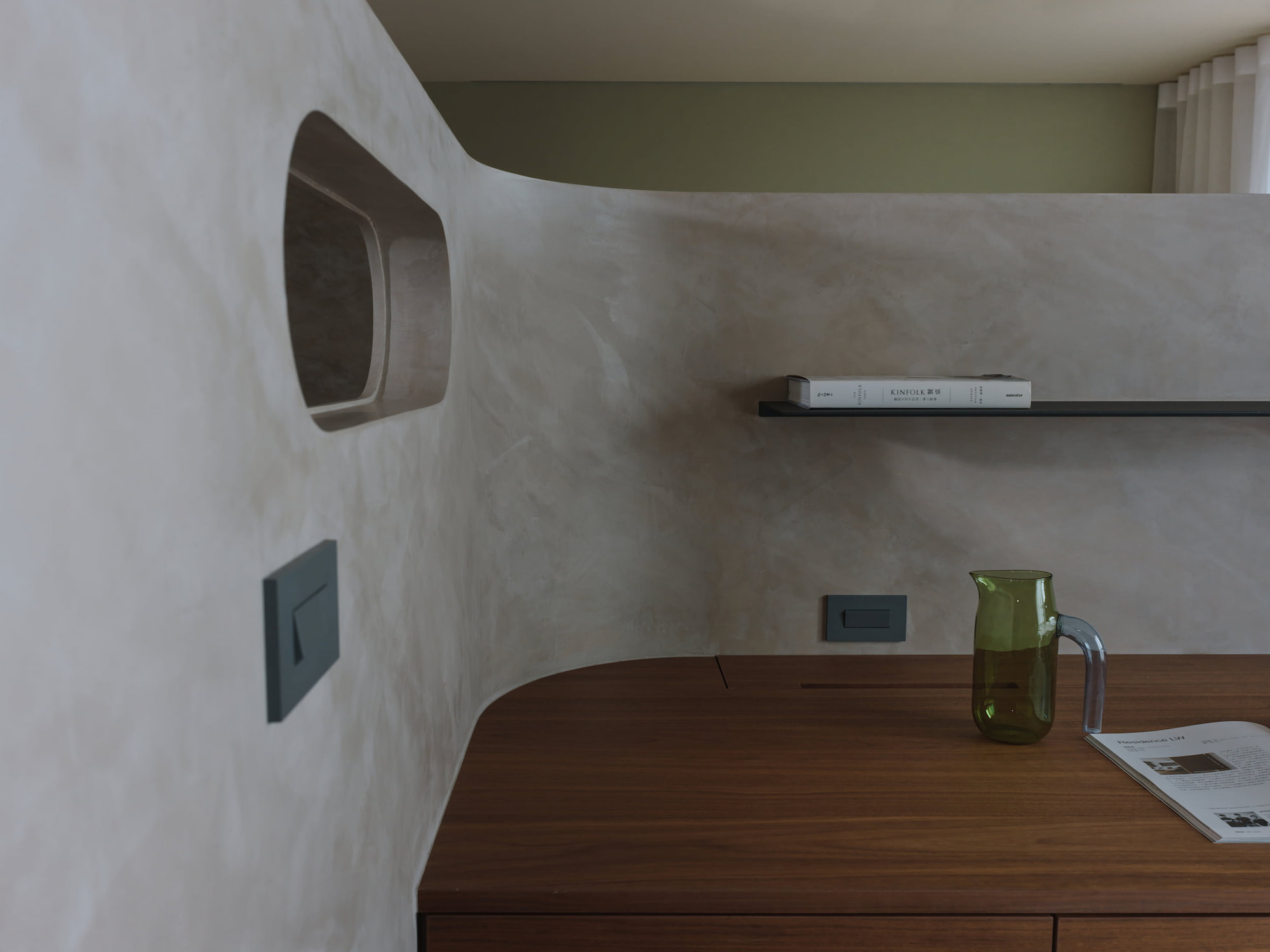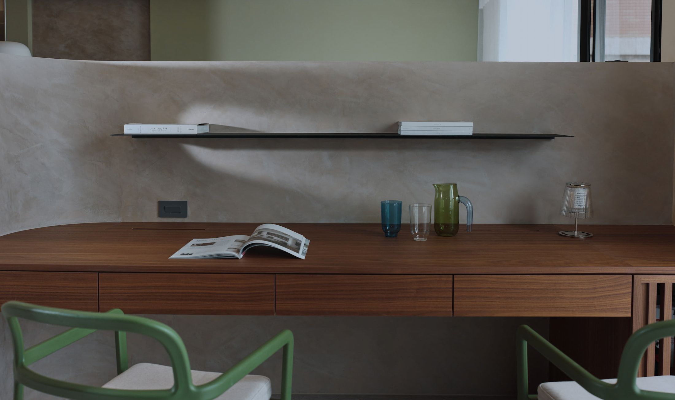 色彩搭配用充滿生機的黃綠色調,輔以沉穩內斂的斯曼特灰,編排出視覺節奏,這種大膽跳躍而和諧的配色比起單一色調,對於幼兒在色彩認知可產生啟發。細節處理上,居家各處轉角均採用圓弧造型,顧及孩童的安全,又為整個空間增添了一份柔和細膩的氛圍。