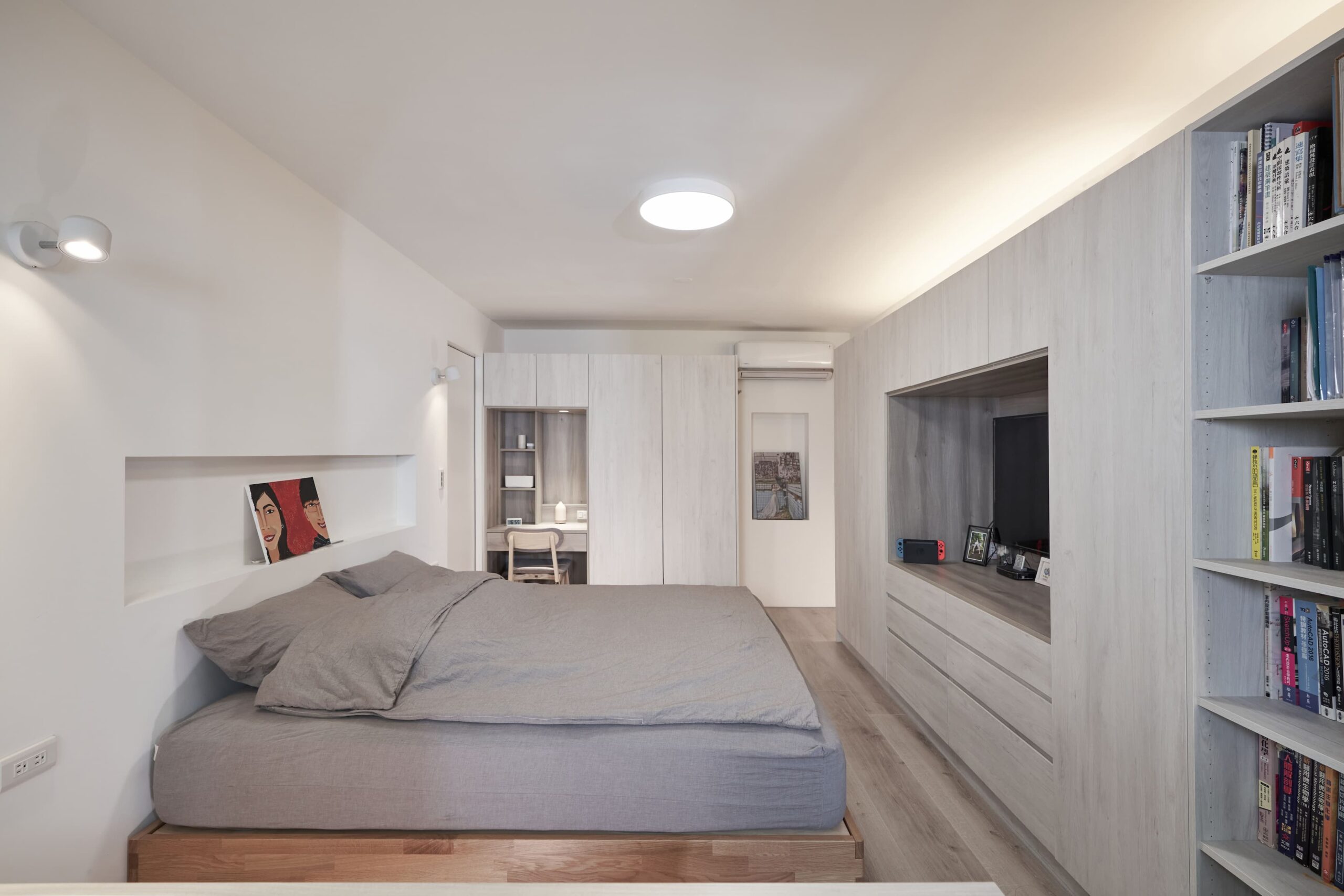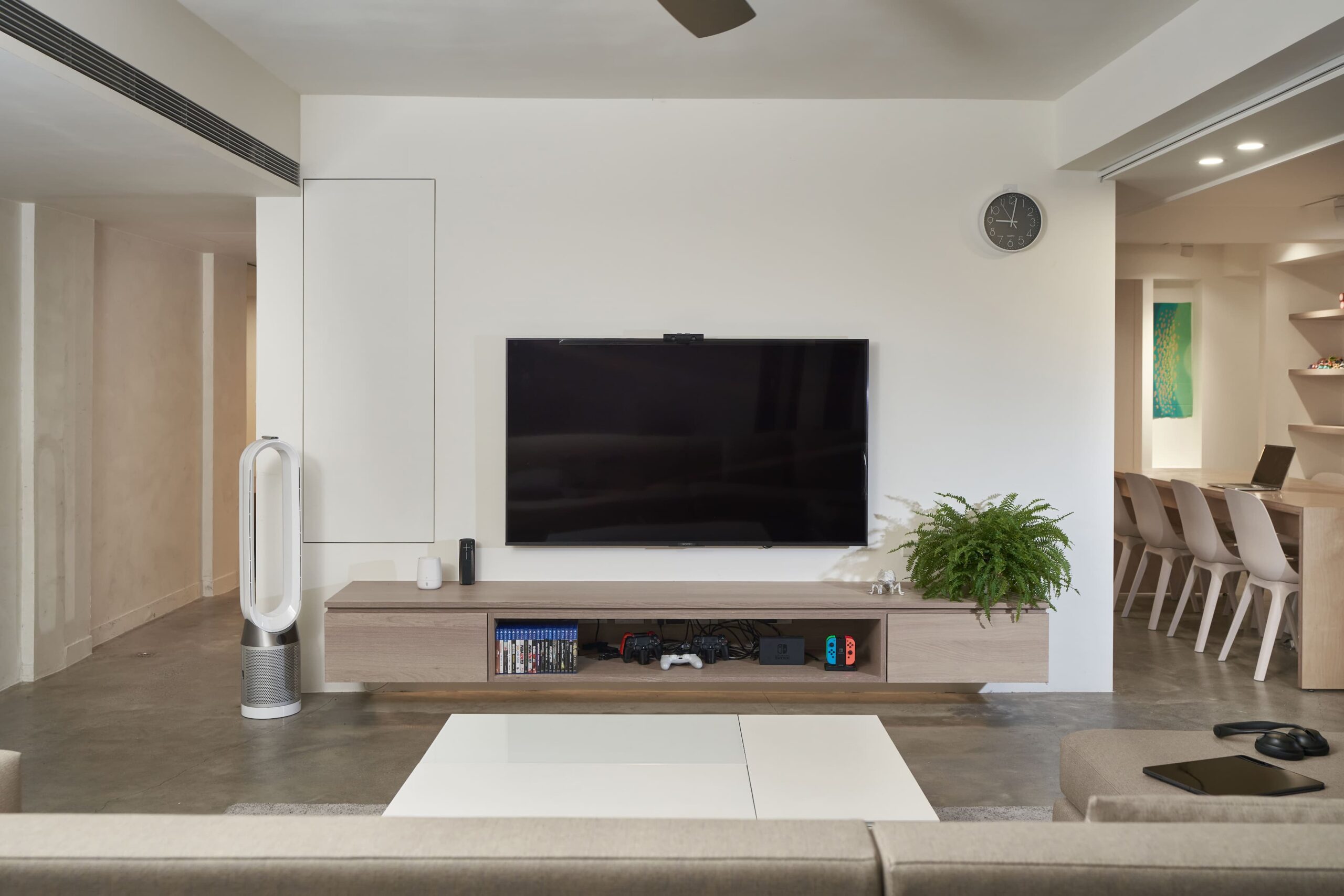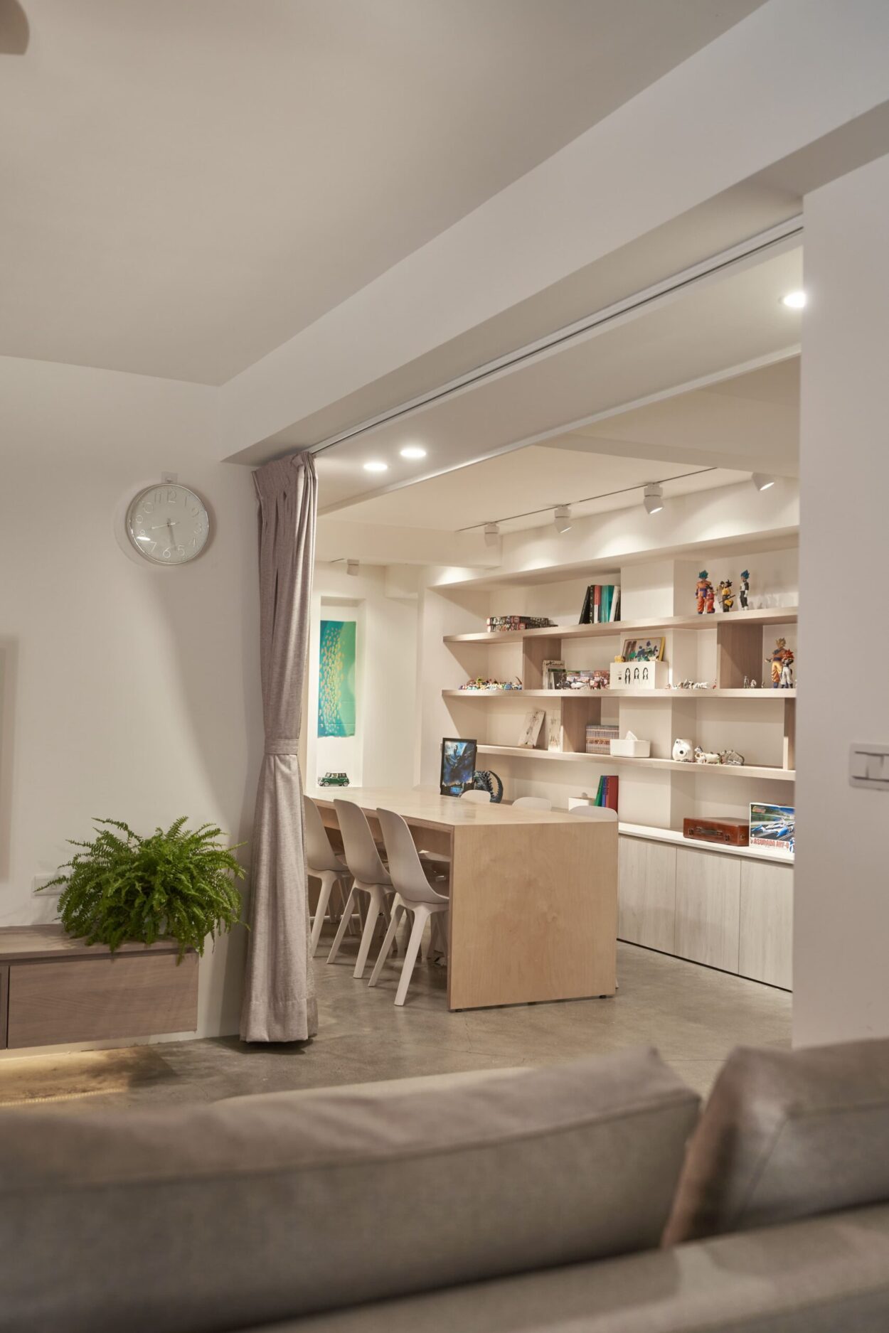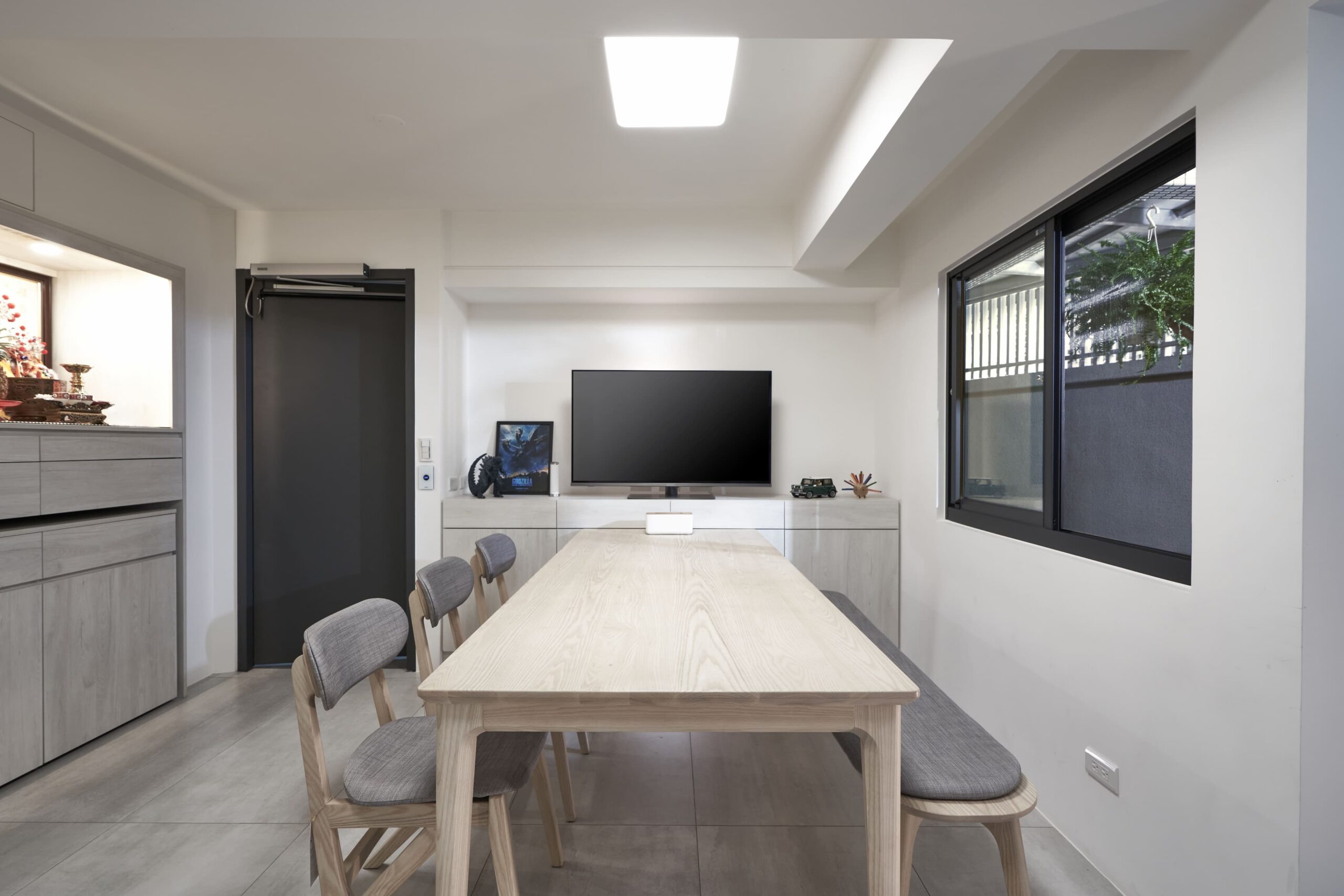 整體空間以素色油漆及水泥原色作為空間背景,強調人與傢俱間的活動,訂製樺木夾板長桌作為交流場所,與側邊水平層板呼應空間軸向性。在成員有不同活動使用情況下,藉由交誼區確保公私領域的獨立性,親友來訪時,好客的主人可以盡地主之誼提供一個放鬆的場所,賓主盡歡。