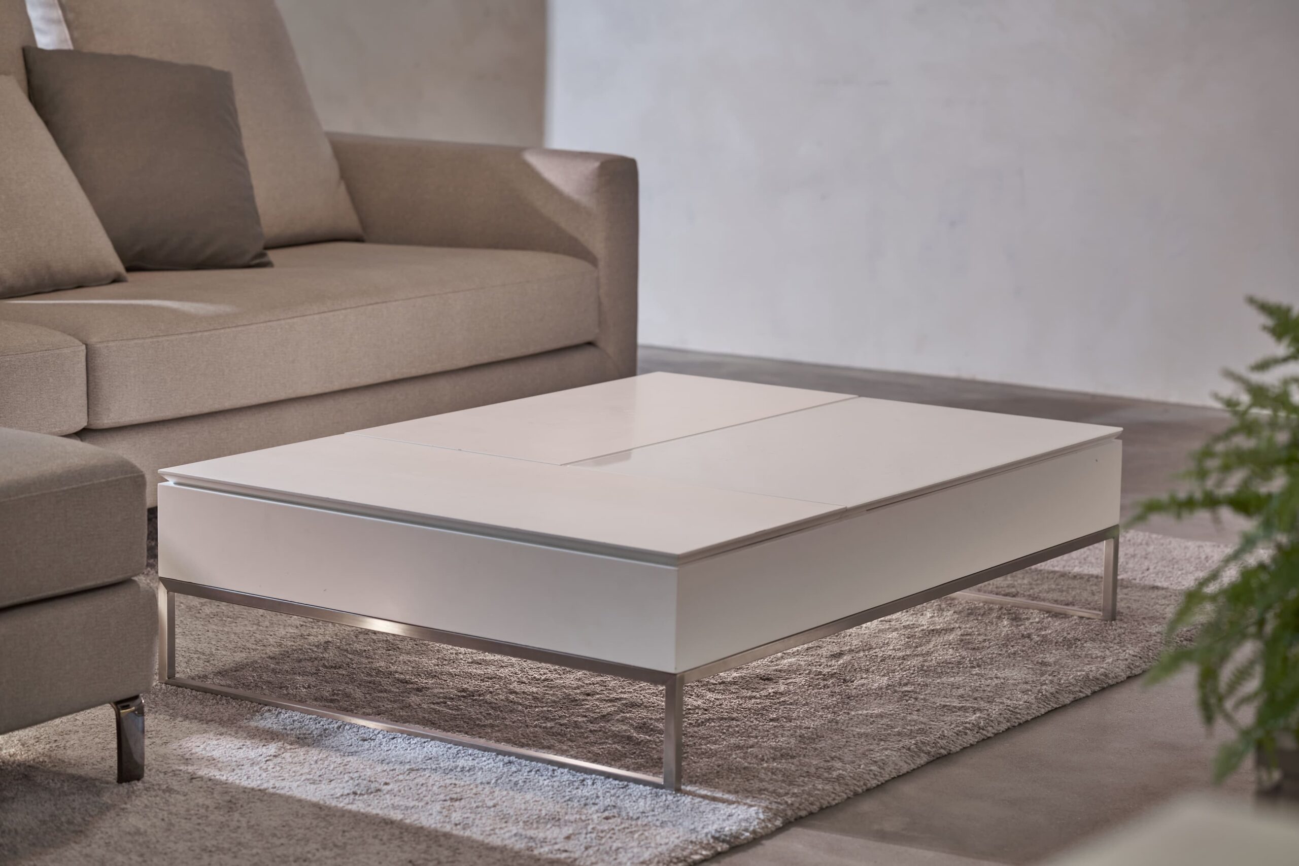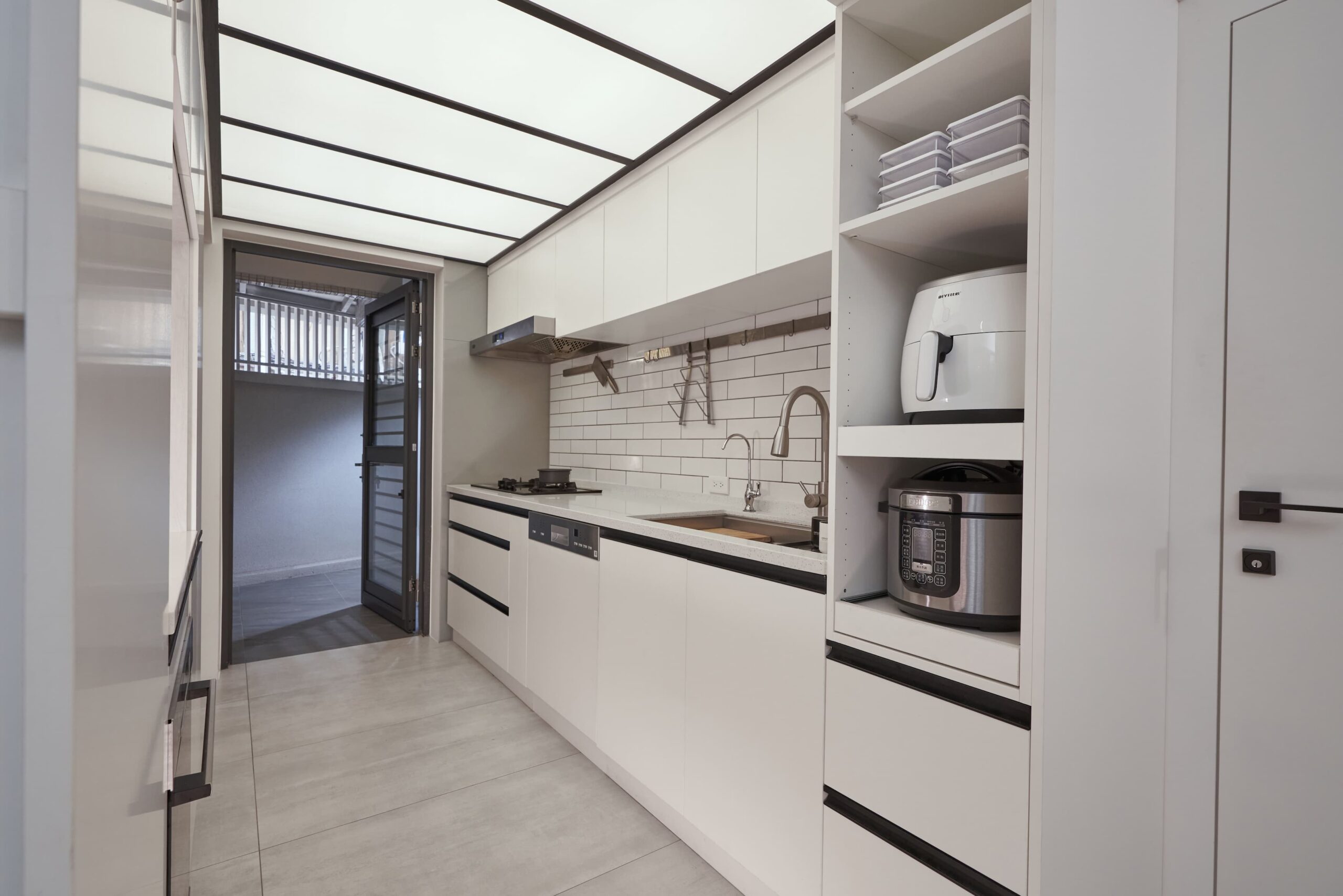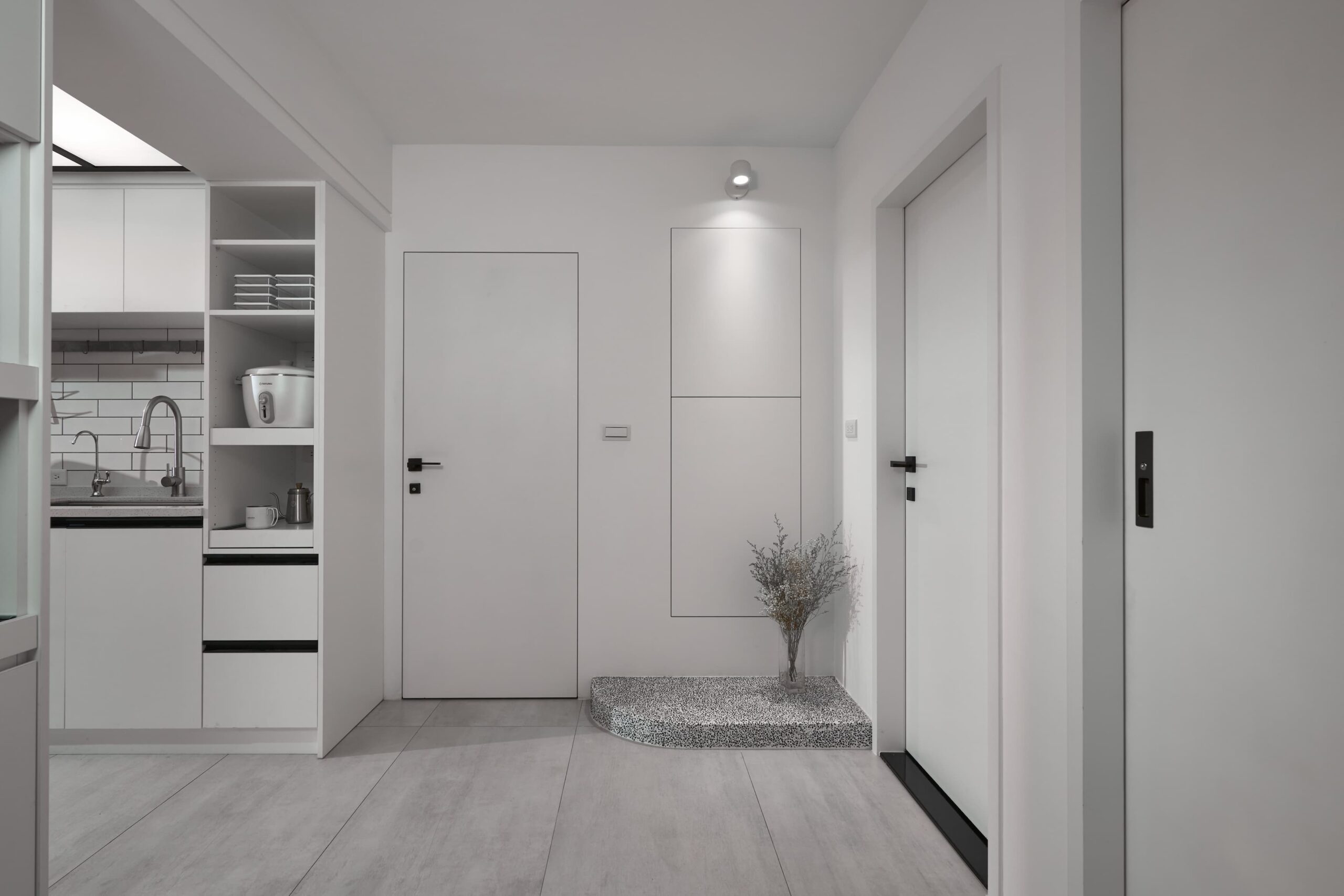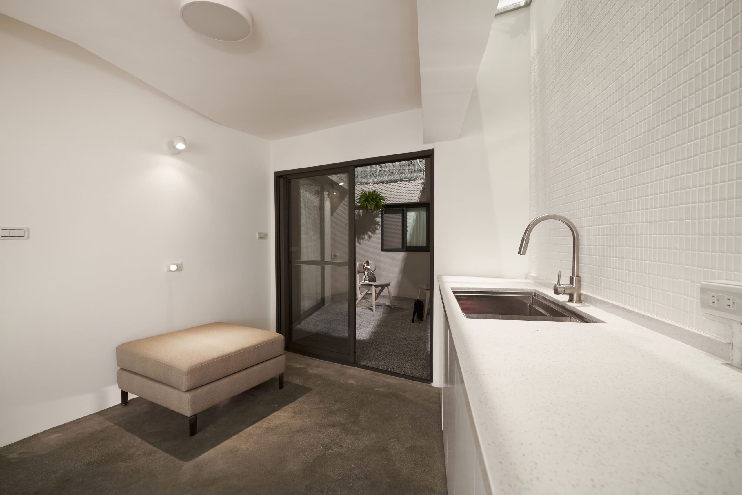 整體空間以素色油漆及水泥原色作為空間背景,強調人與傢俱間的活動,訂製樺木夾板長桌作為交流場所,與側邊水平層板呼應空間軸向性。在成員有不同活動使用情況下,藉由交誼區確保公私領域的獨立性,親友來訪時,好客的主人可以盡地主之誼提供一個放鬆的場所,賓主盡歡。