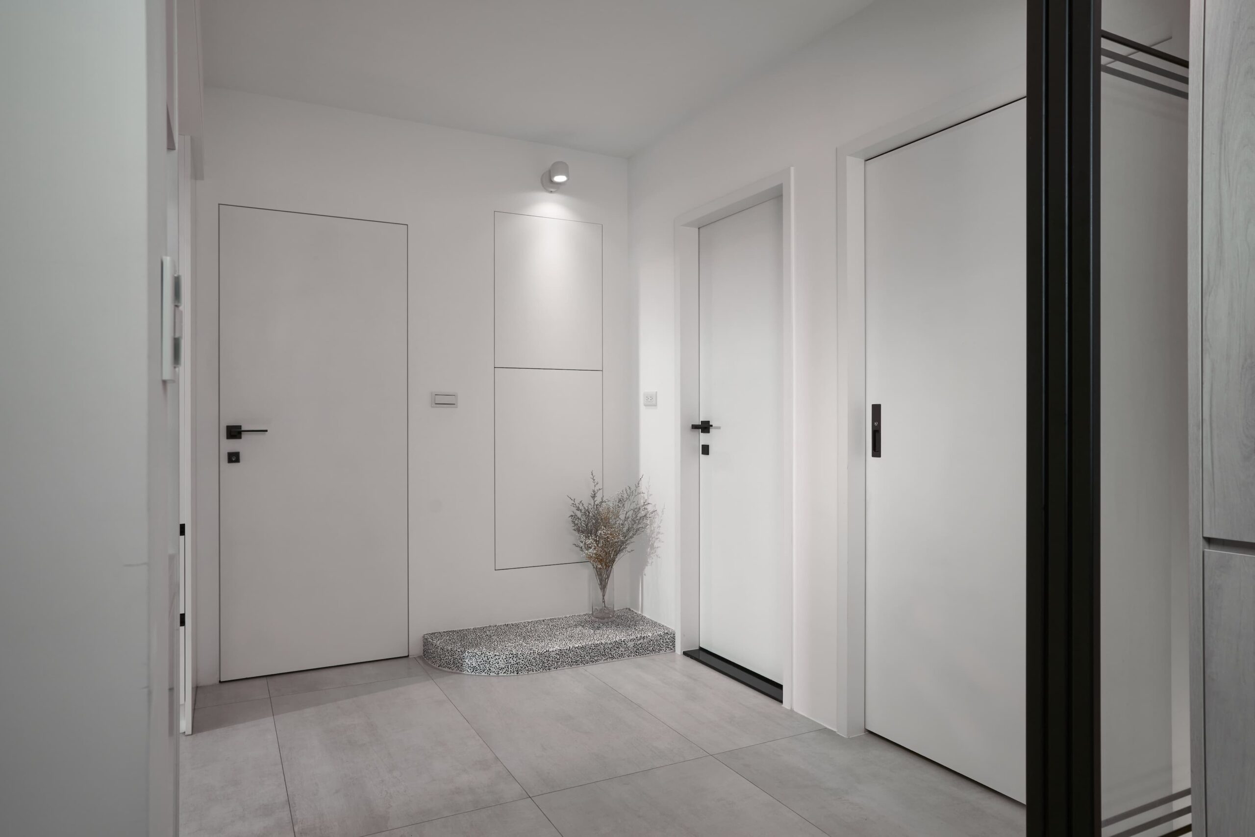 基地位於老城區的舊公寓,有著地下室空間大於地上層的特殊條件。因家中成員有行動不便的長輩,除了一般大門進出外,也規劃了無障礙坡道。同時,將建物座向由東西調整為南北向,使光線更易進入室內。部分圍牆用透空花磚增加空間穿透性。