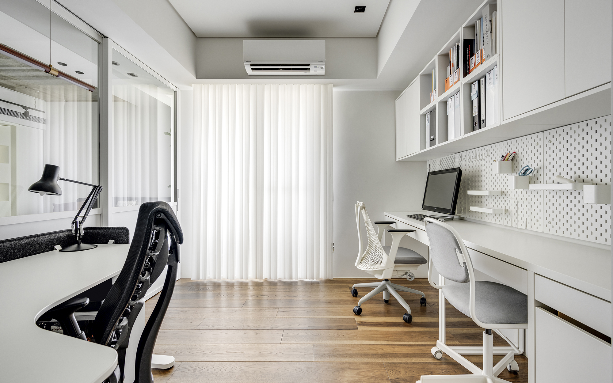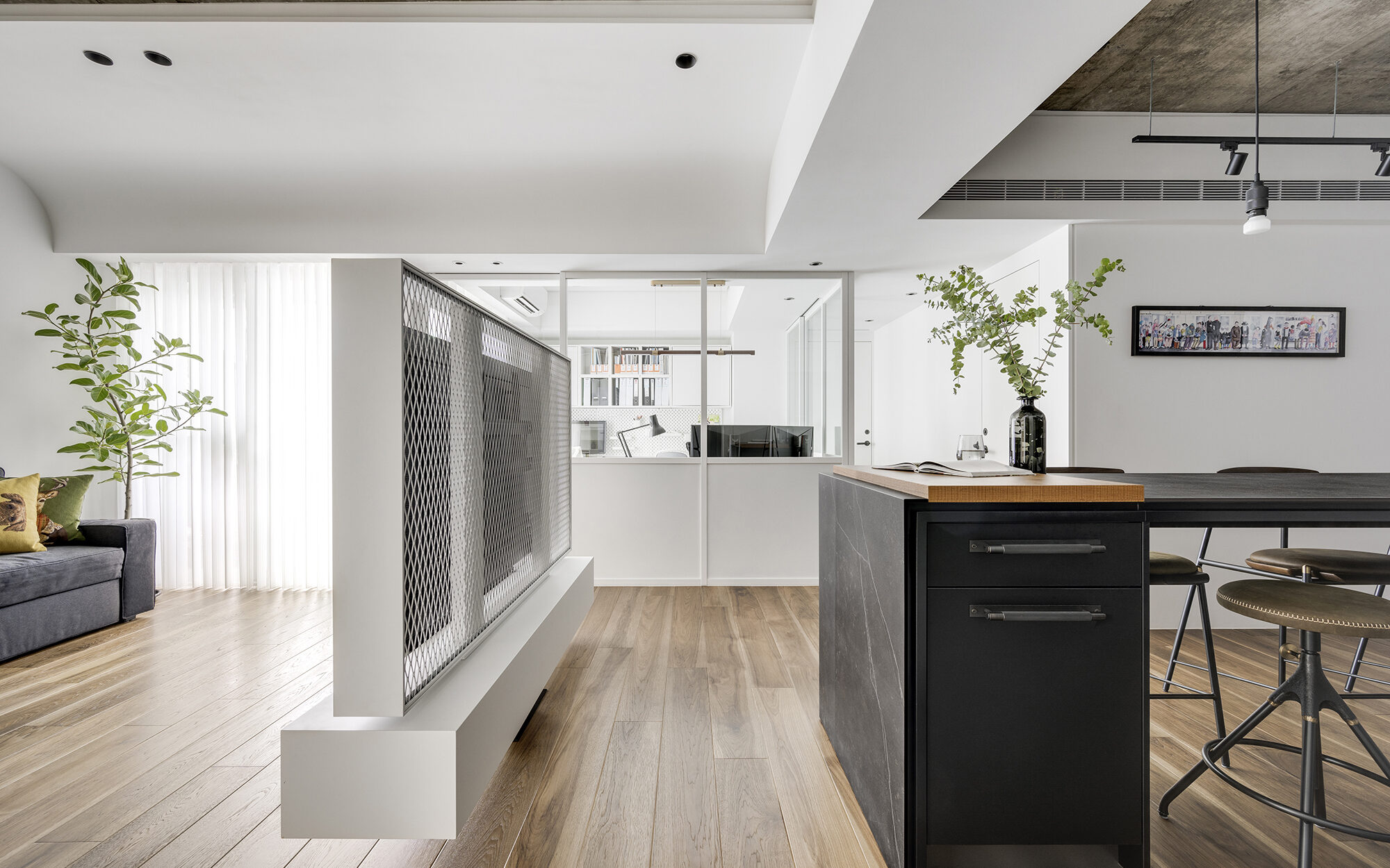 基地主要光線來自東面前陽台的落地窗,如何讓光線進到室內各個角落,成為首要解決的要點。我們將空間中心的臥室隔間牆拆除後,利用辦公空間視覺可穿透的空間性質,引進基地另一道落地窗光線,讓起居空間有充足的自然光。