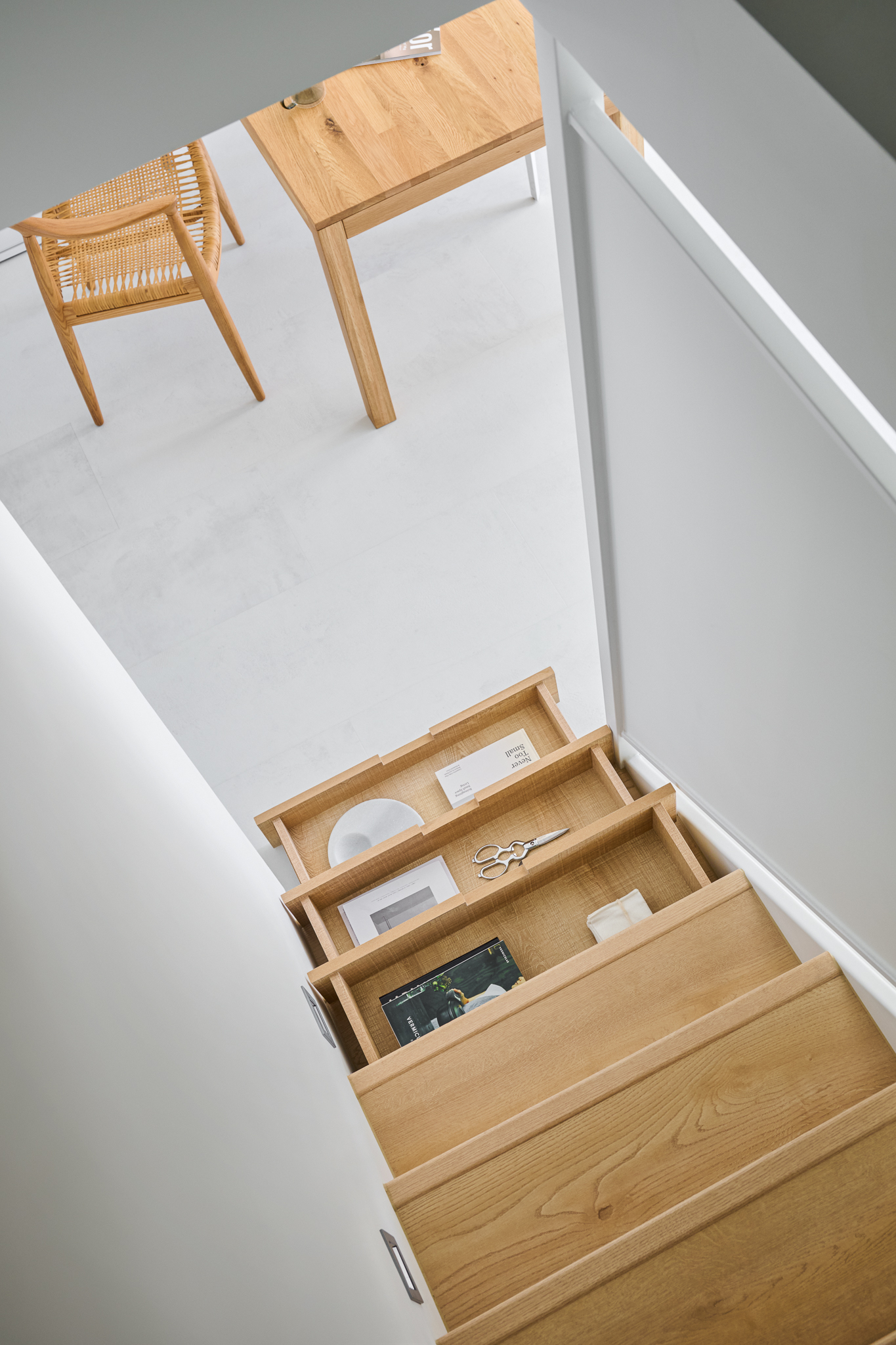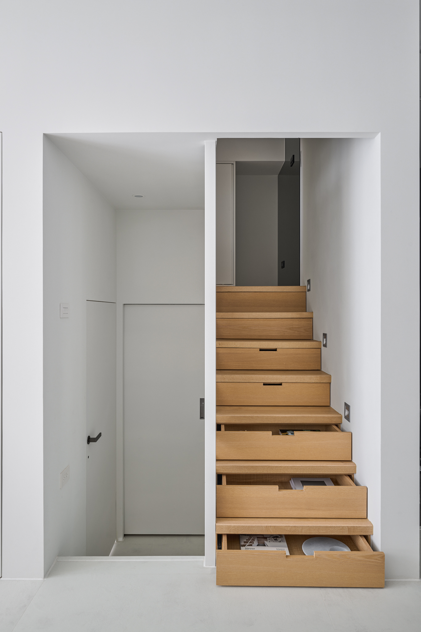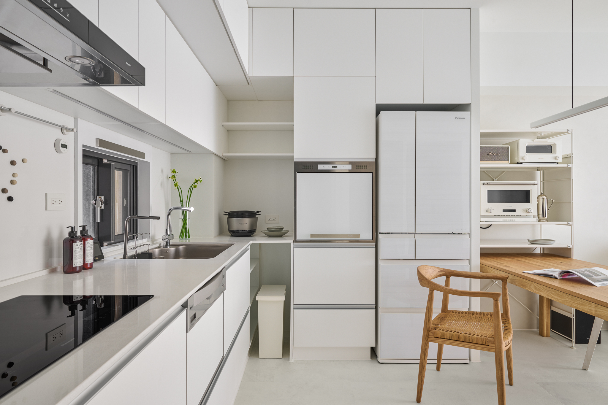 The ground floor is designated as the public area, while the floors below and the second floor are considered private areas. Due to the relatively small area, they are connected with vertical and horizontal lines. The kitchen and dining area are designed in an open plan, with the staircase railings also being transparent, allowing ample comfortable light throughout the entire space. In terms of color, the entrance area is intentionally divided with black tones, while the rest of the space utilizes white with some wood grain accents, creating a bright, comfortable, and natural atmosphere.