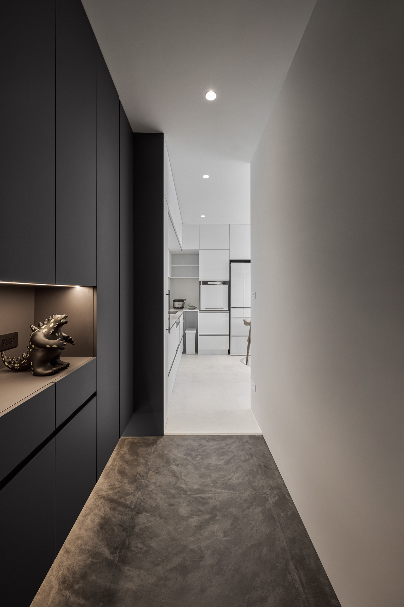In small-space design, adequate functional planning is crucial. The key focus lies in consolidating main storage, kitchenware, and appliances on one side, with a flat façade design to ensure storage functionality without visually overwhelming with numerous cabinets.